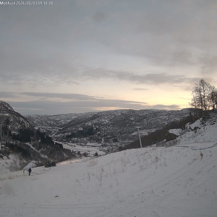 Riktig god søndag alle sammen! Morgenen er av den fine sorten. Klar himmel og en måne som lyser opp over oss. Takk til alle som besøkte oss på skisenteret i går! Det var skikkelig fint for oss å se ekte skiglede i bakken igjen. I dag meldes det om overskya vær, men over oss er det ikke ei sky å se. Skydekket ligger lenger nede i dalen. Det kan jo sige oppover, men vi satser på at det holder seg der nede. Gradestokken viser tolv kalde og vinden er svak. Det produseres snø i nederste trekk for fullt så det er ikke lov å oppholde seg der. Vi har åpent barnebakken og øverste trekk fra kl.10-16.