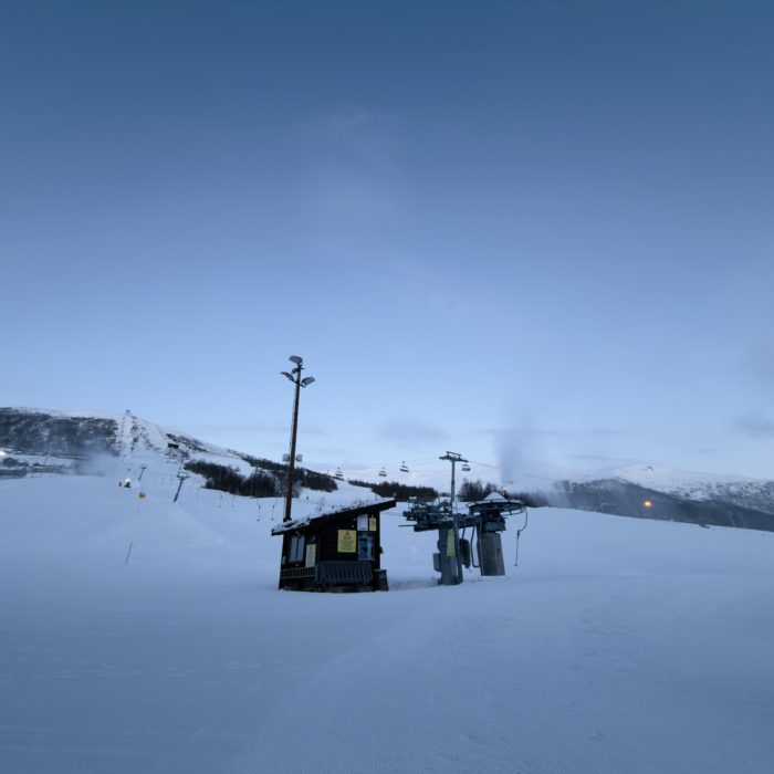 Snøproduksjon pågår så hald avstand til vannslangar, kablar, vifter og lanser.
